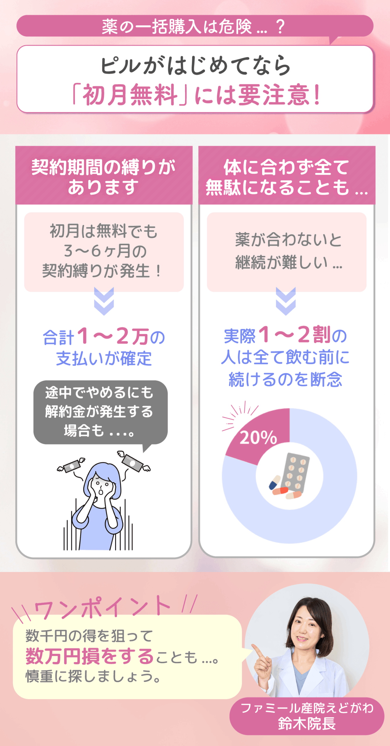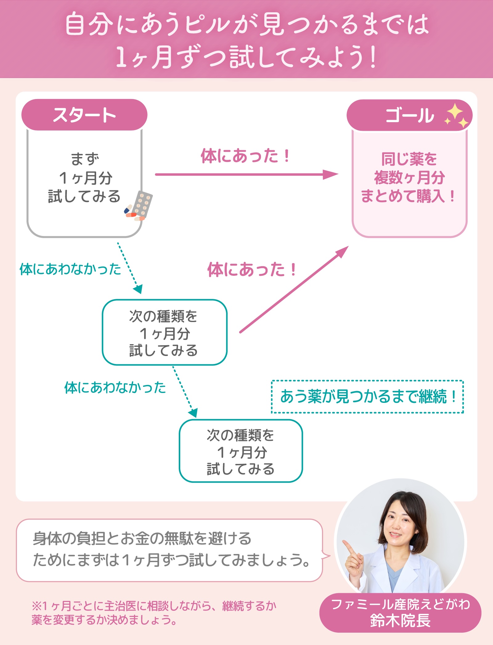 もし合わないピルをまとめて購入してしまうと、数ヶ月分がムダになるだけでなく、つらい症状が続いてしまうこともあります。
