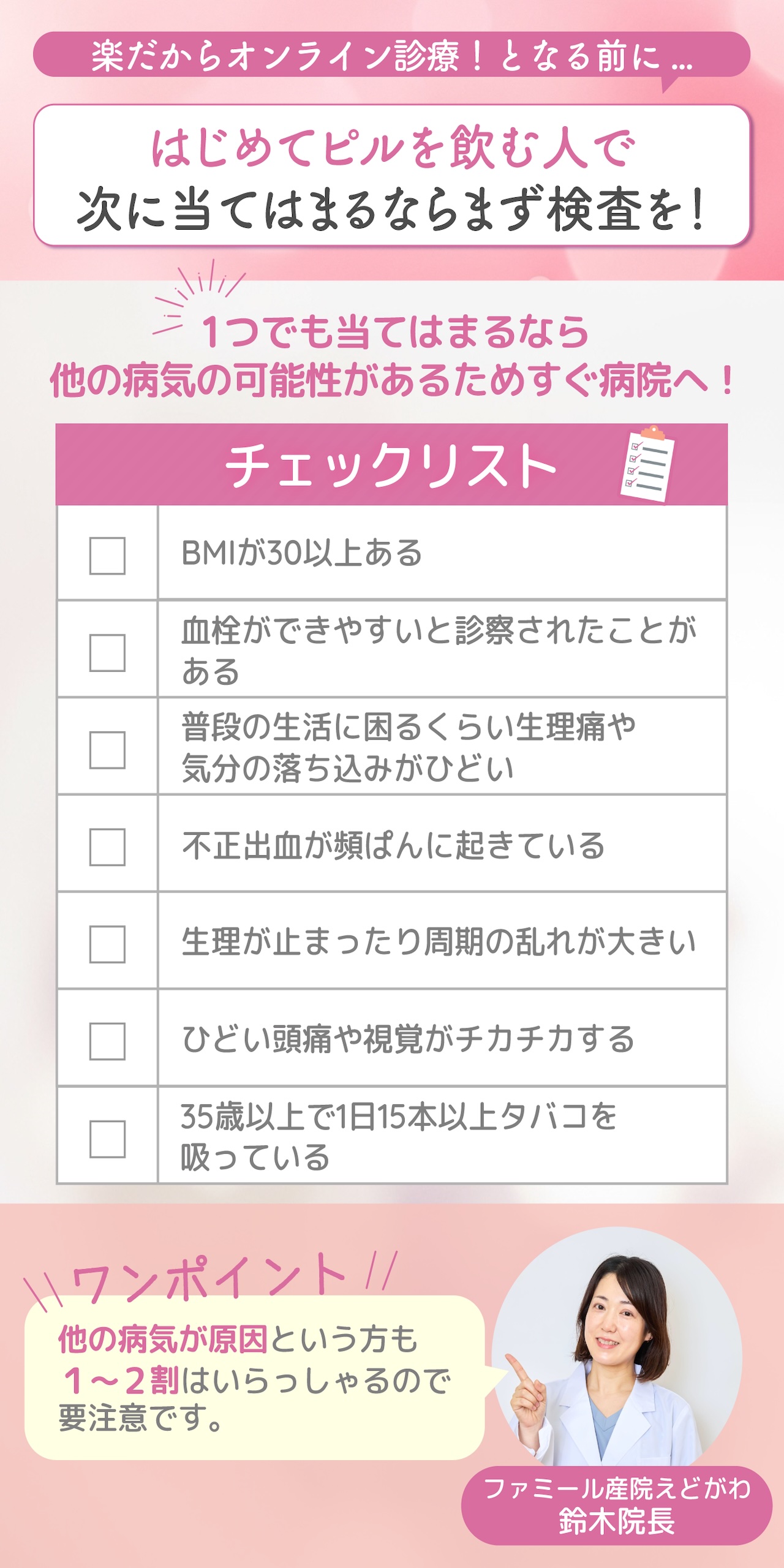 オンライン診療は便利ですが、次のような方は最初に婦人科などの対面診療で検査を受けてください。
