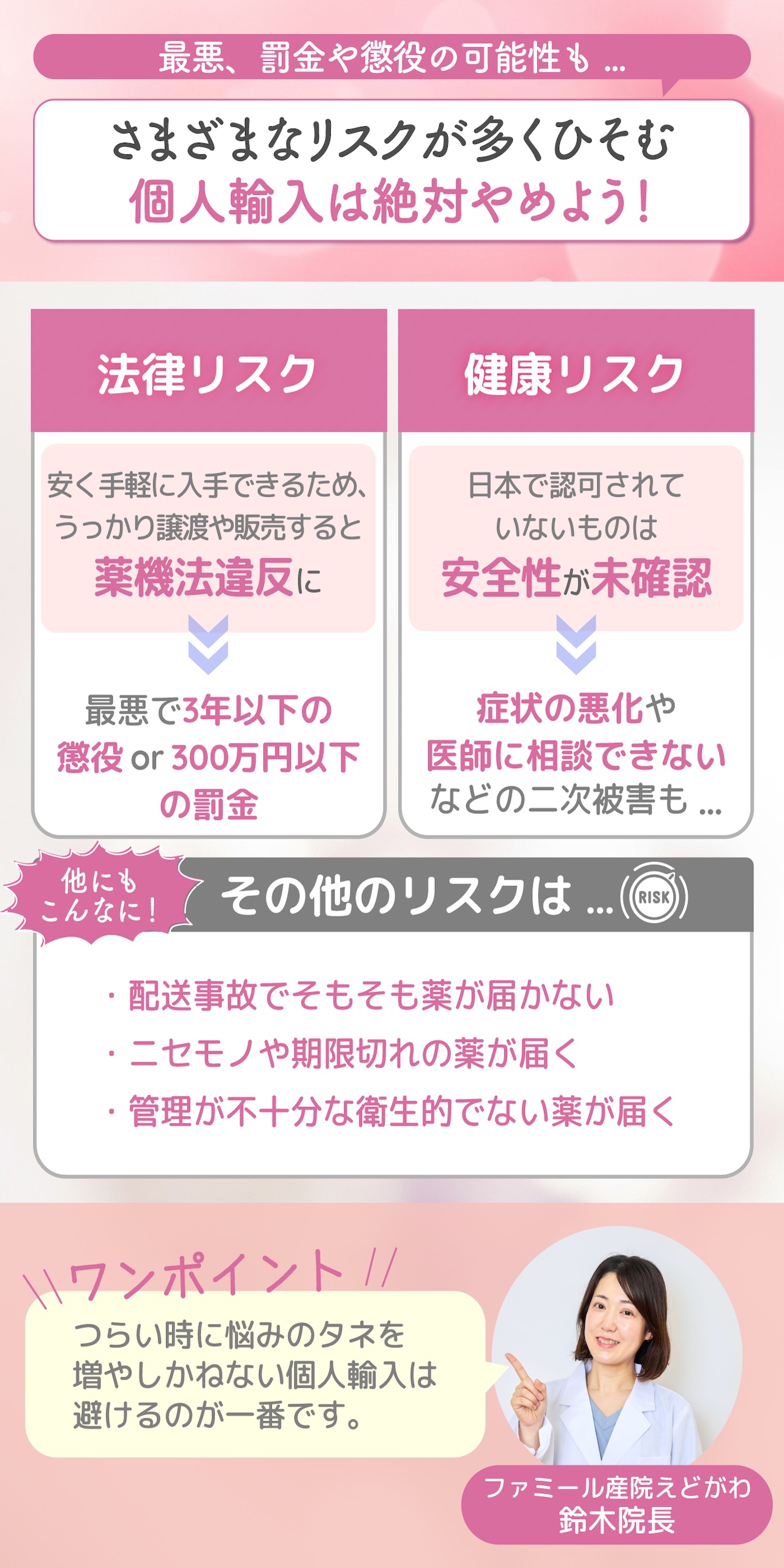 | 健康リスク | 日本で認可がされていない薬は安全性が未確認 | 命に関わる合併症(血栓症、脳梗塞、心筋梗塞など) |